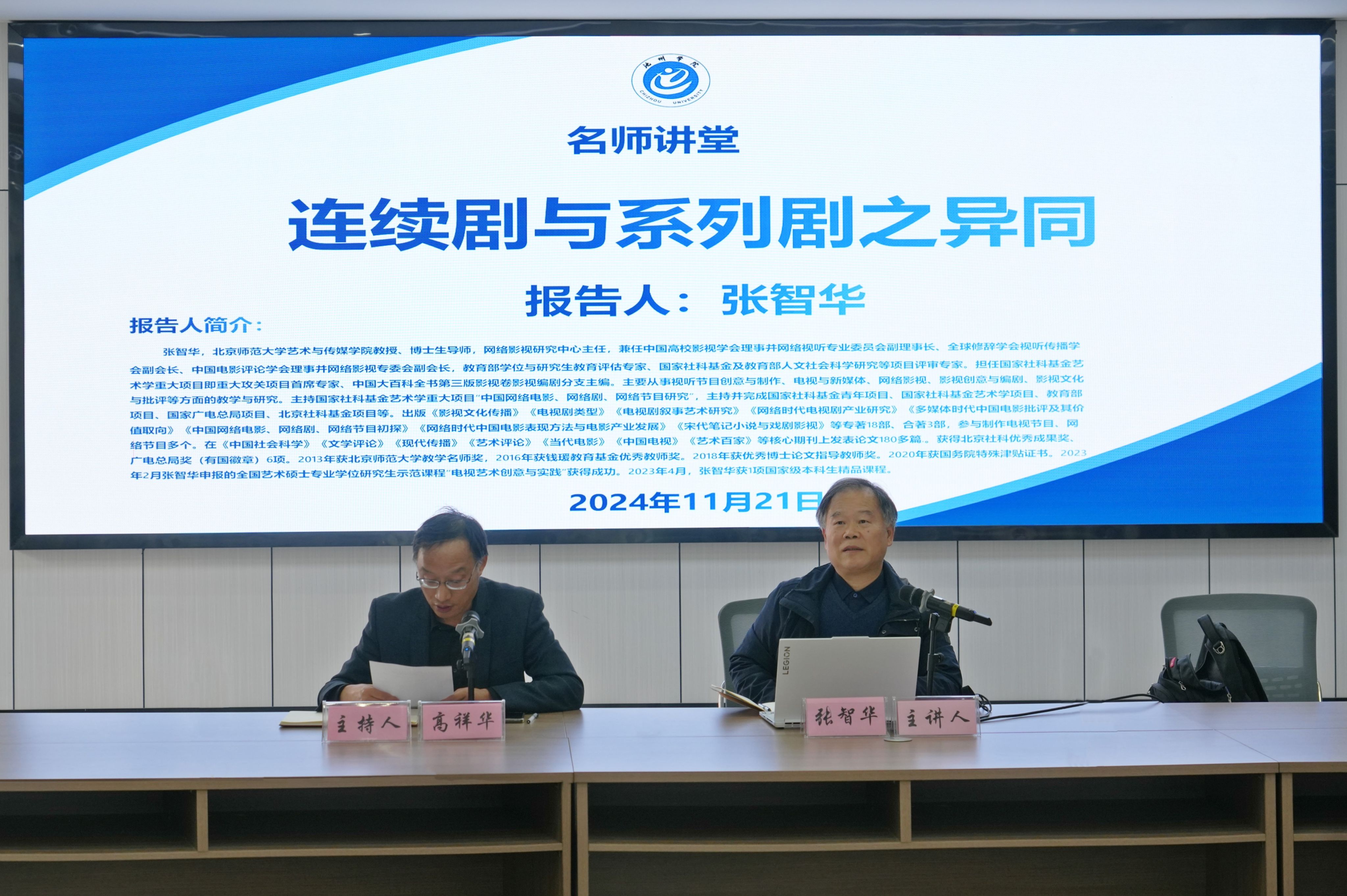 11月21日下午,北京师范大学艺术与传媒学院教授、博士生导师张智华应邀在博物楼视听实训室作了题为“连续剧与系列剧之异同”的学术报告。报告会由文学与传媒学院副院长高祥华主持,传媒专业师生代表参加。