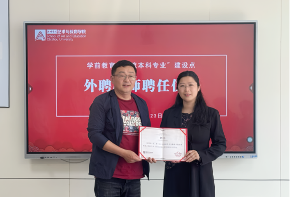 4月23日,在第30个“世界读书日”来临之际,艺术与教育学院特邀知名漫画家、诗人汪幸前来学院开展学术讲座及专业建设交流。在艺术楼三楼会议室,汪幸老师参与了学前教育“一流本科专业”建设点的《幼儿绘本与创作》课程建设研讨会,并被聘为艺术与教育学院外聘指导教师。艺术与教育学院党委书记杨静、院长魏鸿飞,副院长余维君、学前教育专业全体教师参加了聘任仪式。仪式由副院长余维君主持,院长魏鸿飞为汪幸老师颁发聘任证书。