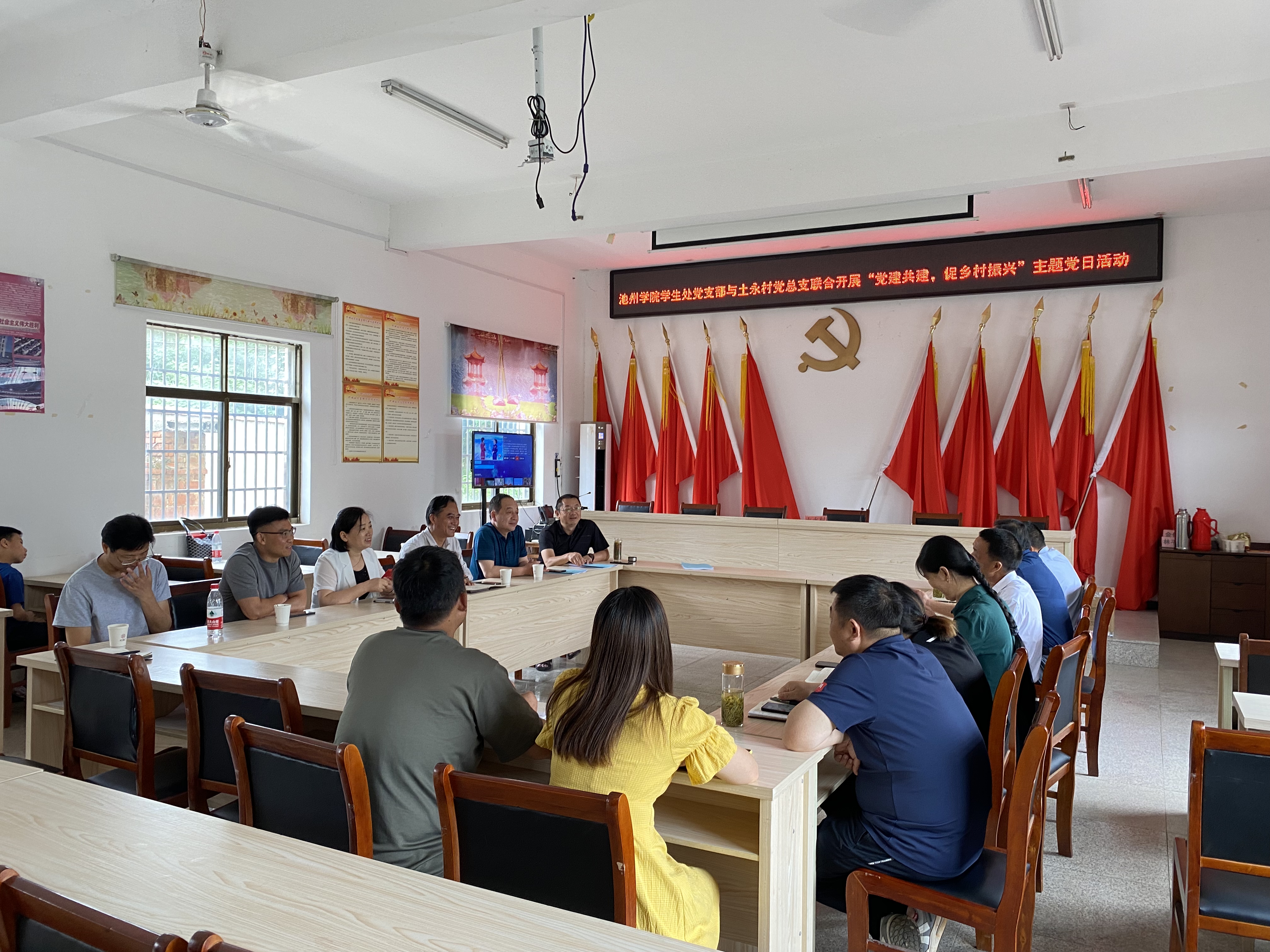 学生处党支部书记洪为宝回顾了学校驻村工作队在土永村曾经的四年多工作及党建引领与支部共建活动,介绍了学校在池州市域乡村振兴与定点帮扶工作情况,对土永村持续高质量发展所取得的成绩表示祝贺,与村两委班子就世界杯官网专家编制的土永村乡村振兴发展规划进行了深入研讨。