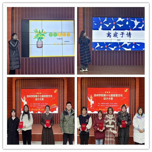 在日常生活中,同学们用独特的视角和新颖的创意,以中华优秀传统文化为寝室赋予了生命力和艺术感。在决赛现场,同学们通过PPT、vlog等形式展现了寝室空间的青春魅力和艺术氛围,获得台下阵阵掌声。经过激烈角逐,体育学院11栋512荣获一等奖,材料与环境工程学院9栋603和文学与传媒学院14栋416荣获二等奖,马克思主义学院11栋515、旅游与历史文化学院11栋212和材料与环境工程学院18栋404荣获三等奖,外国语学院2栋110、马克思主义学院青教2栋105、地理与规划学院26栋413、艺术与教育学院23栋307和大数据与人工智能学院25栋412荣获优秀奖,同时通过线上投票评比产生地理与规划学院26栋413、材料与环境工程学院18栋404、旅游与历史文化学院11栋212和文学与传媒学院14栋211等4个最佳人气奖。