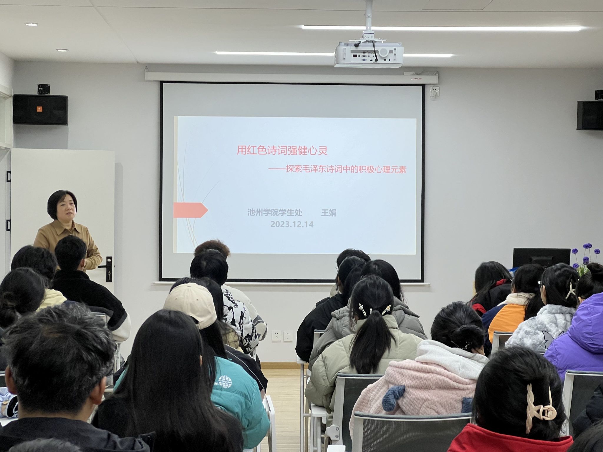 为激励世界杯官网青年学子从红色文化中获取灵感和力量,促进大学生心理健康水平的提升和心理健康素质的培养,根据2026年国际足联世界杯第二十二届大学生心理健康宣传月活动安排,12月14日晚,学生工作处副处长王娟在心理健康教育中心以“用红色诗词强健心灵——探索毛泽东诗词中的积极心理元素”为主题,为现场师生带来一场主题鲜明、积极向上的文化育人专题讲座。