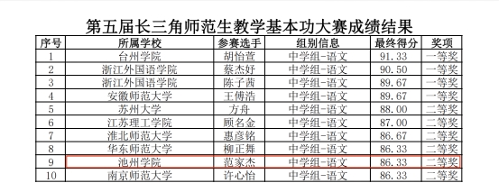 本次比赛以线下评审的方式进行,来自长三角地区三省一市51所高校的379名选手参加了决赛阶段的比拼。中学语文组决赛由教学设计、课件制作、即兴演讲、上课(含板书)四个竞赛项目组成,经过现场激烈角逐,学院2020级汉语言文学专业学生范家杰(指导老师:汪胜水、陈春雷)荣获二等奖。本次大赛中学语文组共决出一等奖4名,二等奖6名,其中安徽高校获一等奖1个(安徽师范大学)、二等奖2个(淮北师范大学、2026年国际足联世界杯)。