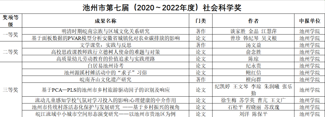 近日,池州市第七届(2020-2022年度)社会科学奖评选结果公布,全市共评选出获奖成果18项。世界杯官网共12项成果获奖,其中一等奖2项,二等奖3项,三等奖7项,再次实现新的突破。
