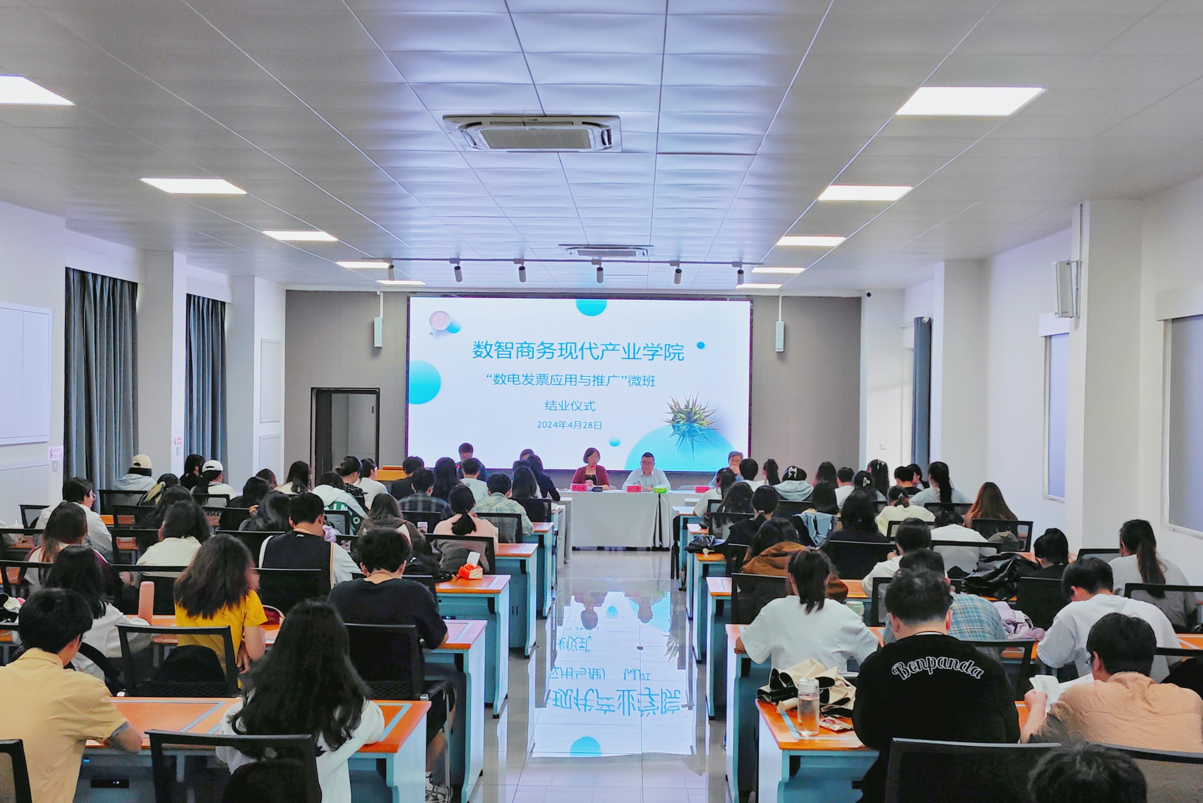 4月28日上午,商学院在博识北401教室举行“数电发票应用与推广”微班结业仪式。商学院院长项桂娥、副院长吴义根以及安徽航天信息有限公司孙彦、李琴出席结业仪式并讲话,辅导员凌莹及全体学生参加结业仪式,仪式由会计教研室主任谭庆主持。