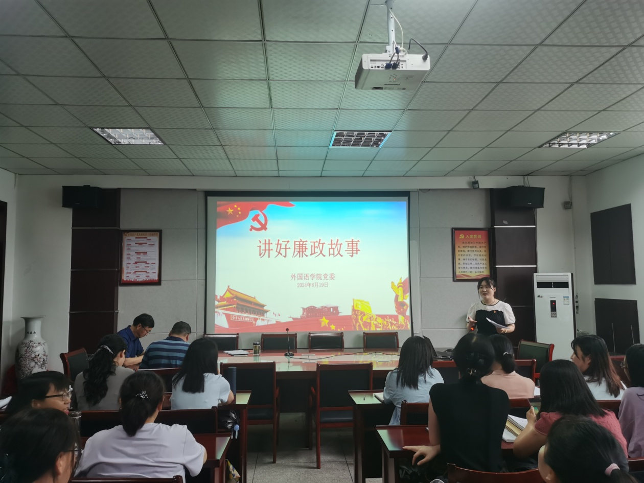 为进一步推动党纪学习教育走深走实,切实强化党风廉政建设,6月19日下午,外国语学院在会议室开展“讲好廉政故事”专题活动。全体党员教师参加,活动由外国语学院党委书记张乐民主持。