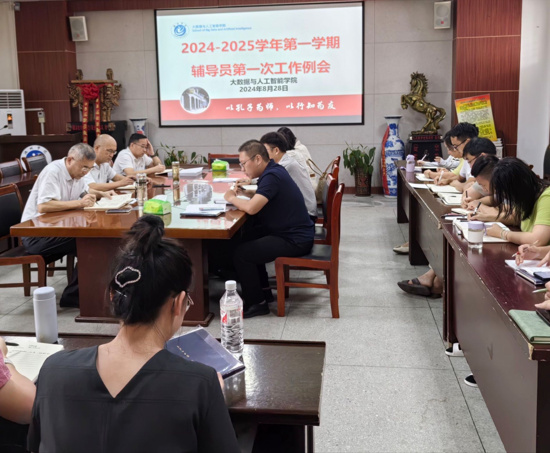 为做好大数据与人工智能学院学生工作,系统化推进学风建设,提升辅导员的专业化、职业化水平,8月28日下午,大数据与人工智能学院在博奕楼南会议室召开了新学期辅导员工作例会,学院党委领导班子、学院专兼职辅导员参加了此次会议。