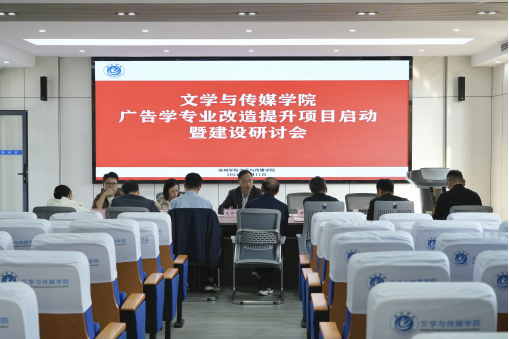 10月11日,文学与传媒学院广告学专业改造提升项目启动暨建设研讨会在博物楼视听实训室举行。安徽省广告协会名誉秘书长刘先艾,蚌埠学院艺术设计学院院长胡飞等专家和有关从业人员参会。会议由学院广告学教研室主任郑珺主持。