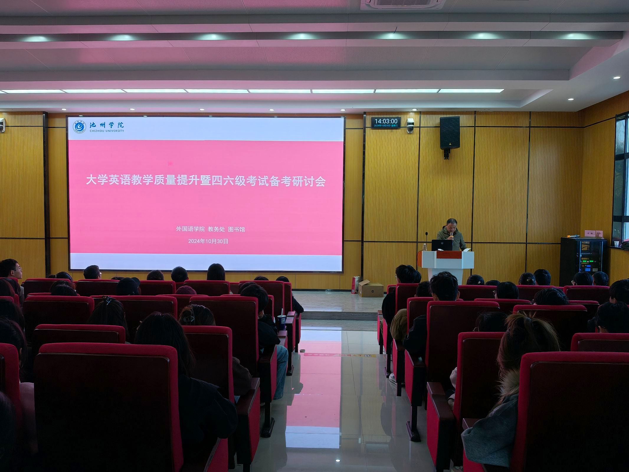 为深入探索大学英语教学质量提升之道,有效指导学生高效备考英语四六级考试,10月30日,外国语学院在公教楼东报告厅举办大学英语教学质量提升暨四六级考试备考研讨会。外国语学院院长余义兵、教务处副处长洪锋、图书馆副馆长胡祖信、外国语学院教师代表以及全校学生代表参加会议。研讨会由外国语学院副院长宋婷主持。