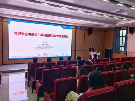 为进一步深入学习贯彻习近平总书记关于教育的重要论述、学习宣传习近平同志《论教育》,引领世界杯官网师范类和教育学类专业学生深刻领会其时代背景和政治意义,切实增强责任感和使命感,2024年12月4日下午,教务处组织开展学习习近平总书记关于教育的重要论述以及习近平同志《论教育》为主题的讲座,安徽师范大学教育系主任、硕士生导师徐赟担任主讲嘉宾,学校师范类专业和教育学类专业300余名学生聆听讲座,教务处副处长李应华主持讲座培训会。