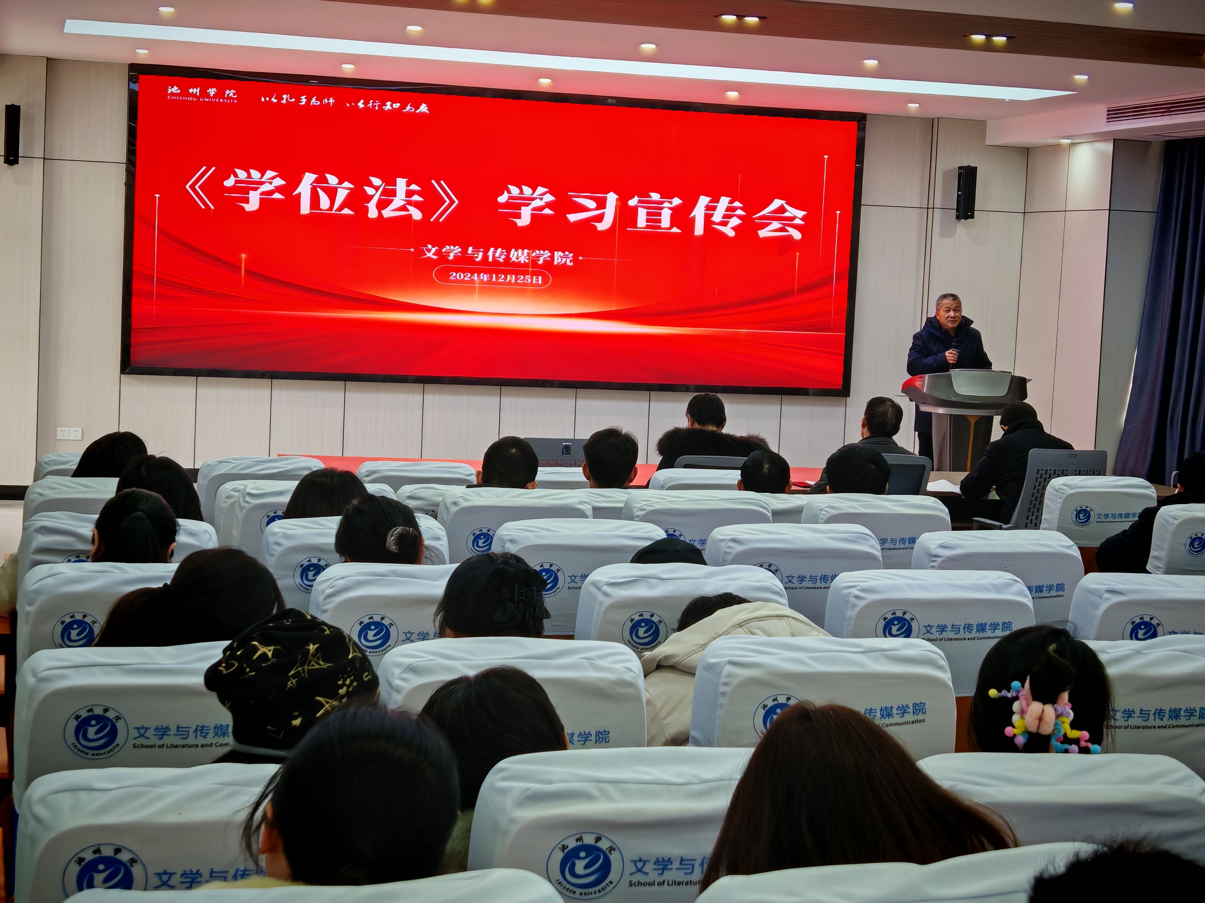 为深入贯彻落实《中华人民共和国学位法》,文学与传媒学院于12月23日至25日召开院党政联席会议、全体教职工大会,各支部召开支部会议、各班级召开班会,同时利用学院官网组织学习宣传《学位法》。