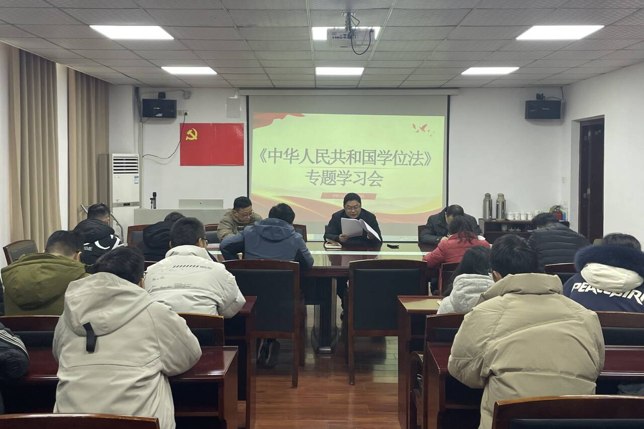12月24日上午,学院在会议室开展了《学位法》的专题学习活动,教研室主任及学院教师参加。学院院长吴国志领学了《学位法》,并就下一步严格按照学校要求贯彻实施《学位法》工作方案做出了具体的部署和安排。各教研室在会后积极组织本教研室教师展开自学,并认真收集心得体会及工作建议。辅导员通过开展主题班会的形式带领学生对《学位法》进行了深入学习。
