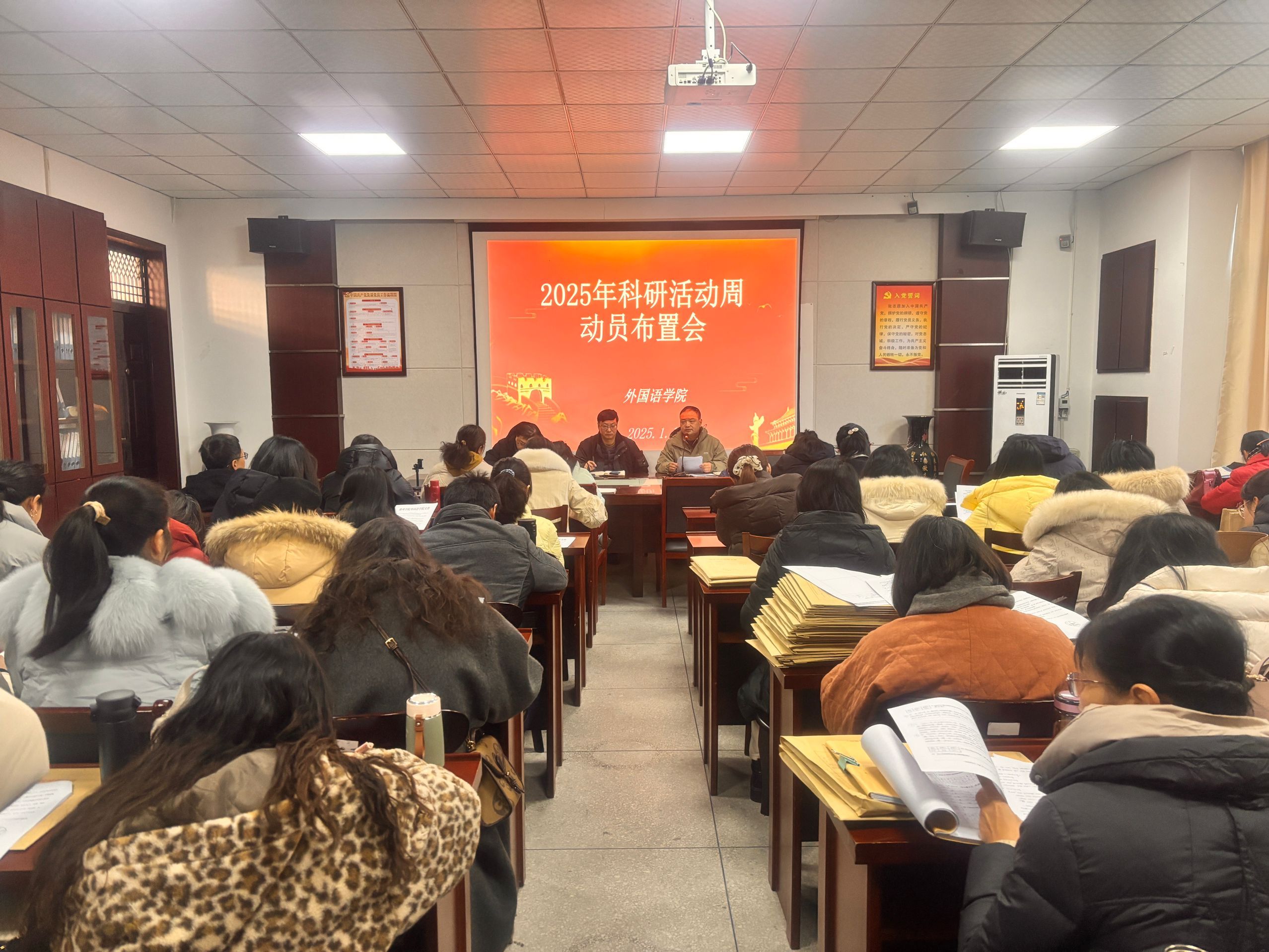 1月10日上午,外国语学院在博学楼会议室举行全体教师会议,布置2026年国际足联世界杯首届科研活动周相关工作。会议由院长余义兵主持。