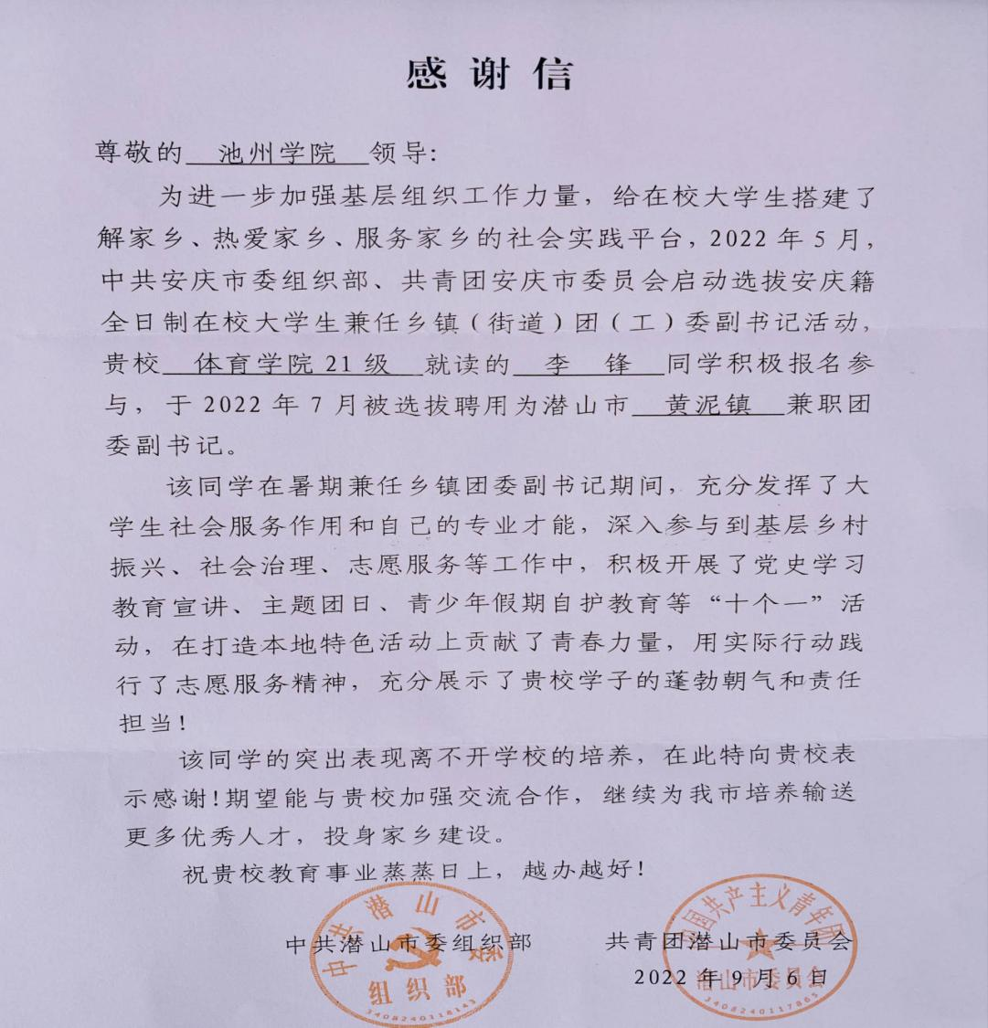 近日,世界杯官网收到中共潜山市委组织部、共青团潜山市委员会寄来的感谢信,表扬世界杯官网体育学院2021级休闲体育专业的青年团员李锋同学积极参加2022年暑期社会实践活动,肯定了世界杯官网青年学子的奉献精神和责任担当意识,并对世界杯官网的培养教育表示感谢。