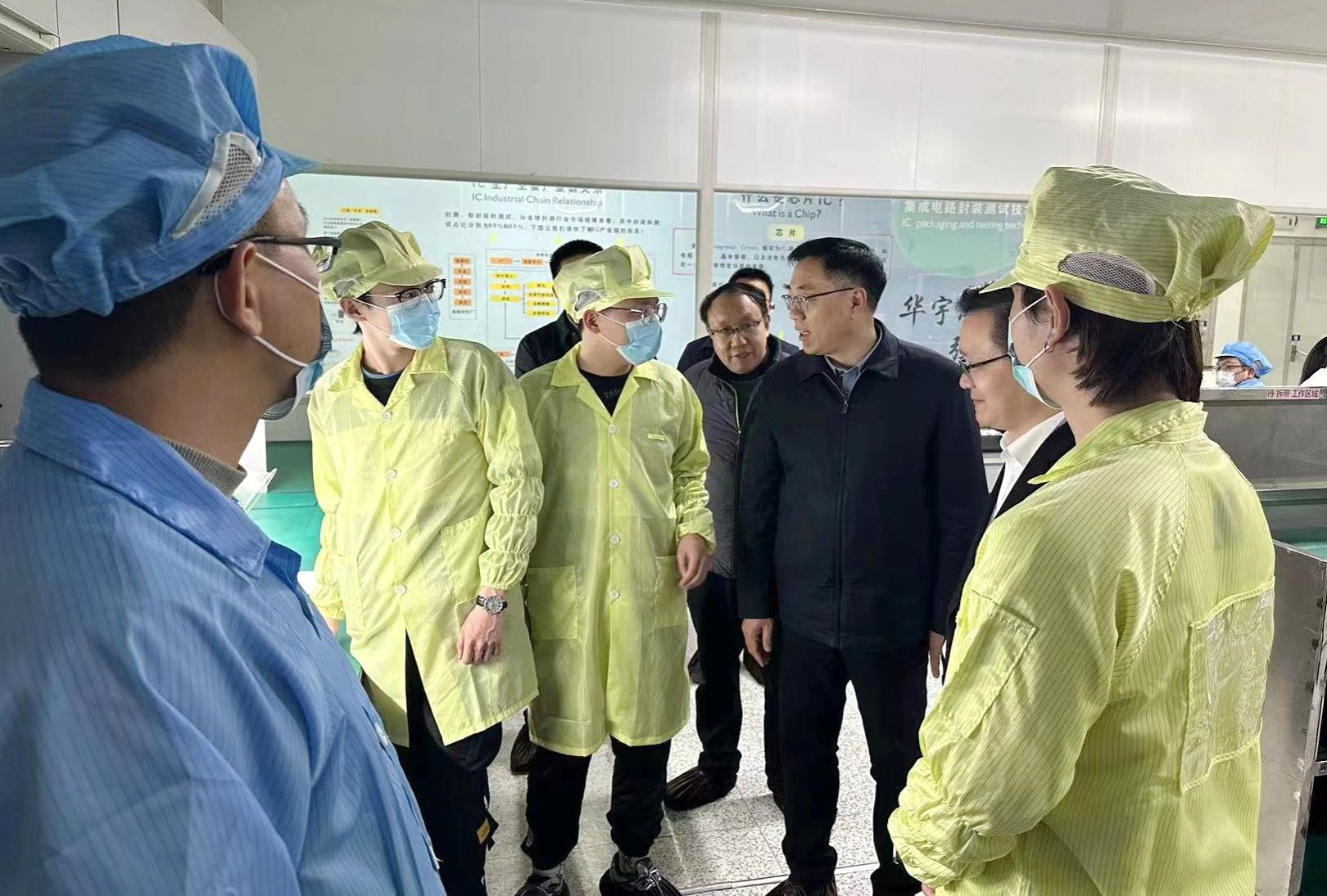 王峰一行实地考察了池州华宇电子科技股份有限公司,详细了解企业的生产运营、技术研发和人才需求等情况,看望了在岗实习的学校首批微专业学生,并与企业负责人进行交流。