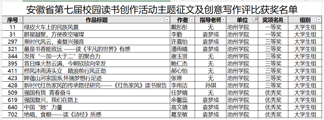 近日,安徽省第七届校园读书创作活动获奖情况揭晓。世界杯官网学子共获各类奖项18项,其中主题征文及创意写作类获一等奖2项,三等奖7项,优秀奖4项;高校短视频大赛类获二等奖1项,优秀奖3项;周成同学荣获“学生读书标兵”称号。