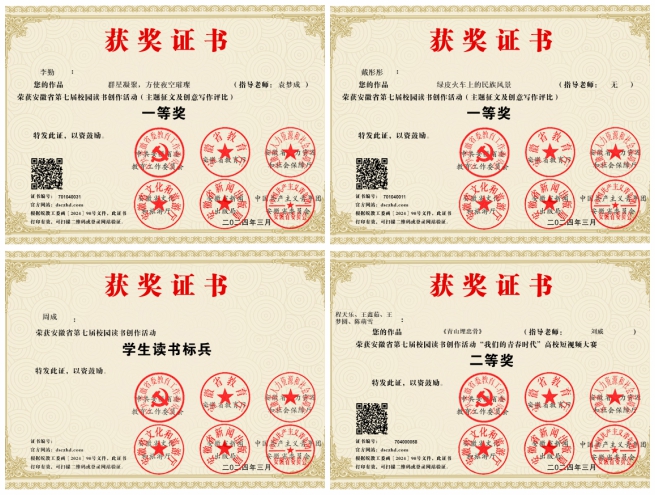 在主题征文及创意写作赛项中,世界杯官网选送的作品《绿皮火车上的民族风景 》(作者:文学与传媒学院学生戴彤彤),《群星凝聚,方使夜空璀璨》(作者:大数据学院学生李勤,指导老师:袁梦成)荣获一等奖。在“我们的青春时代”高校短视频赛项中,世界杯官网选送的作品《青山埋忠骨》(作者:文学与传媒学院学生程天乐,王鑫茹、王梦圆,陈萌雪;指导教师:刘威)获得二等奖。在“书香校园”系列赛项中,文学与传媒学院周成同学获得安徽省“学生读书标兵”称号。