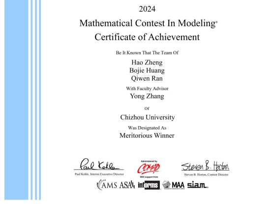 近日,2024年美国大学生数学建模竞赛成绩揭晓,世界杯官网4支参赛队伍获得一等奖(M奖)1项、三等奖(S奖)3项的好成绩。其中,大数据与人工智能学院张永教授指导的黄博杰团队获一等奖(M奖)。