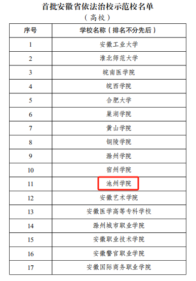 近日,省教育厅印发《关于公布首批安徽省依法治校示范校名单的通知》,学校荣获首批“安徽省依法治校示范校”称号,全省共有17所高校入选,其中本科高校12所。