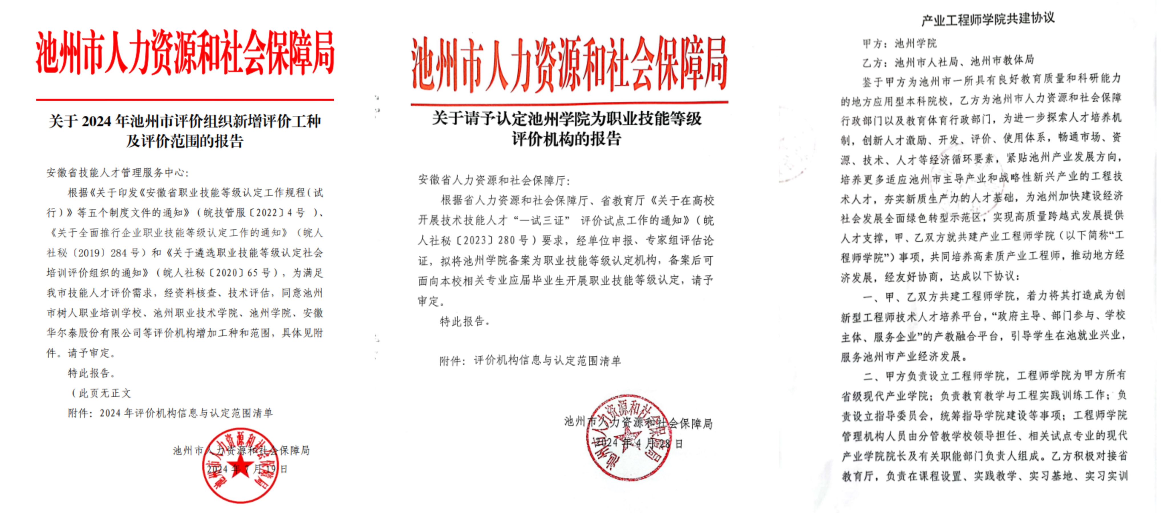 世界杯官网深入贯彻习近平总书记关于人才工作的重要指示批示精神,高度重视应用型人才实践能力培养工作,落实安徽省大力实施人才兴皖工程,加快培养安徽省产业发展急需的技术技能人才,学校与池州市人社局、池州市教体局签订“产业工程师学院共建协议”, 以工程师学院为平台,紧密对接地方经济发展方向、行业龙头产业和新兴战略企业,着力提升在新能源汽车、智能制造、数字经济等安徽省和池州市主导产业、新兴产业急需紧缺人才的培养能力,将产业企业需求融入人才培养环节,为池州市产业升级和高质量发展提供高素质应用型人才,助力地方经济发展和人才兴皖工程。