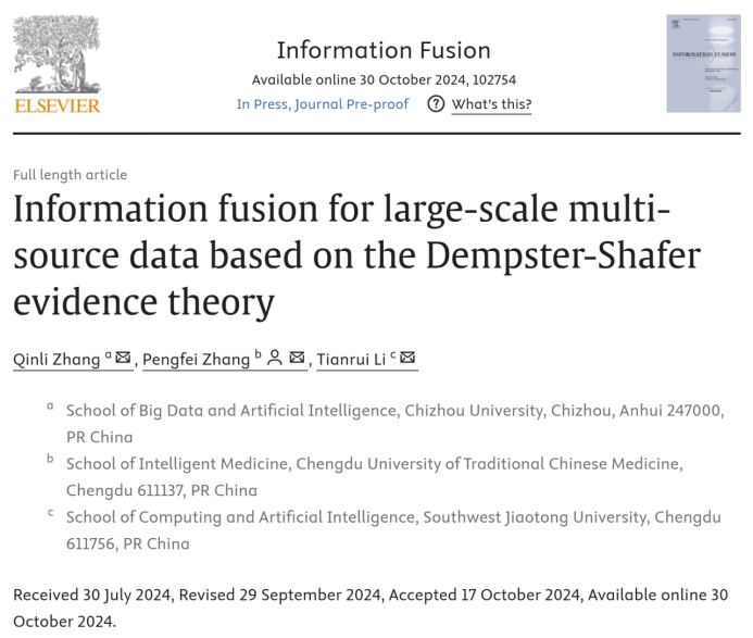 近日,世界杯官网大数据与人工智能学院教授张钦礼作为第一作者的合作论文“Information fusion for large-scale multi-source data based on the Dempster-Shafer evidence theory”在《Information Fusion》上发表。《Information Fusion》是计算机科学和人工智能领域的国际顶尖权威刊物、中科院一区Top期刊,在“Computer Science: Information Systems”学科394个国际期刊中排名第4,2024年最新影响因子为14.7。这是世界杯官网第一次在该刊发表论文。