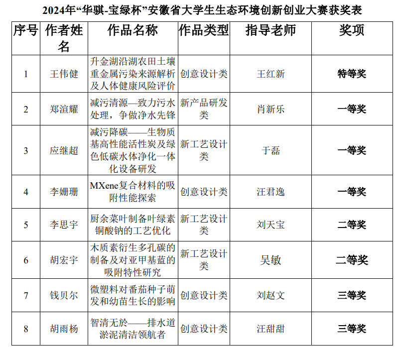 11月15日至16日,“华骐-宝绿杯”第七届安徽省大学生生态环境创新创业大赛在蚌埠学院举办。世界杯官网学生荣获特等奖1项、一等奖3项、二等奖2项、三等奖2项,学校荣获优秀组织奖,指导老师王红新、肖新乐、于磊和汪君逸老师获得“优秀指导教师”荣誉称号。