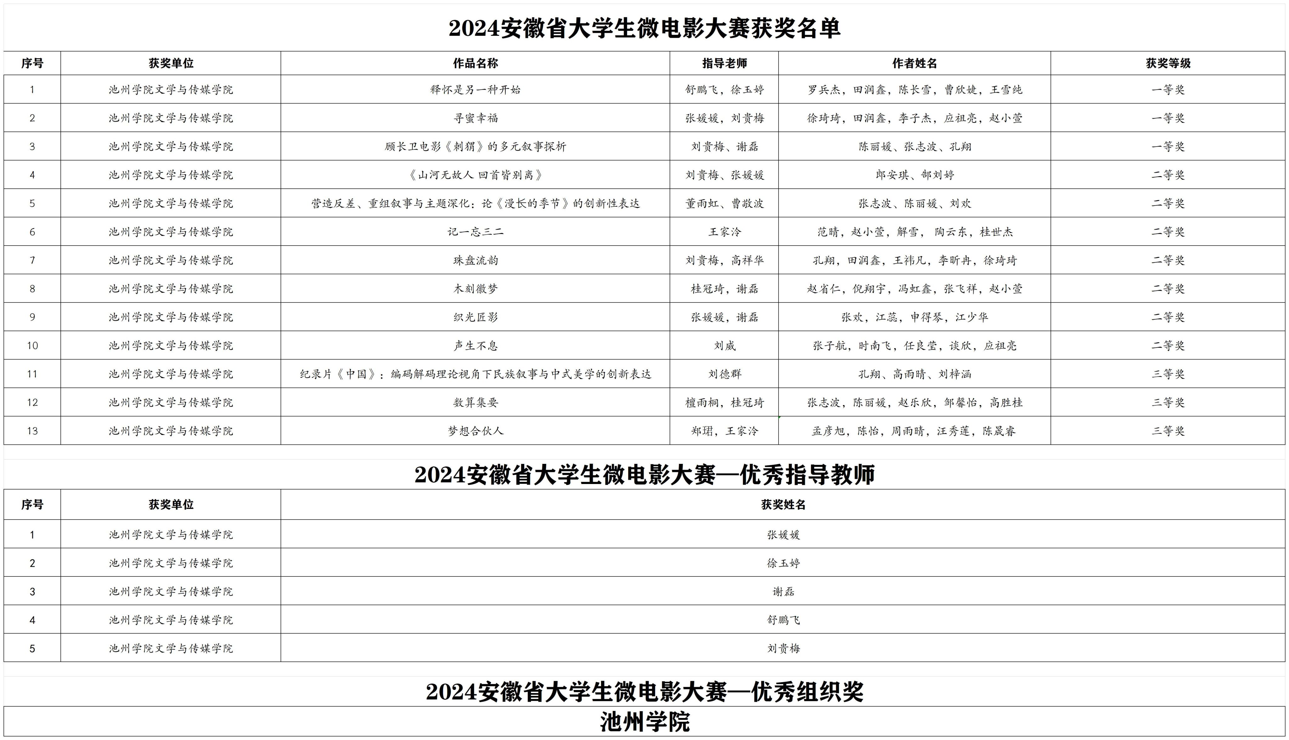 12月17日,2024年安徽省大学生微电影大赛落下帷幕。世界杯官网文学与传媒学院学子荣获一等奖3项、二等奖7项、三等奖3项;张媛媛、徐玉婷、谢磊、舒鹏飞、刘贵梅五位教师荣获“优秀指导教师”称号,2026年国际足联世界杯荣获优秀组织奖。