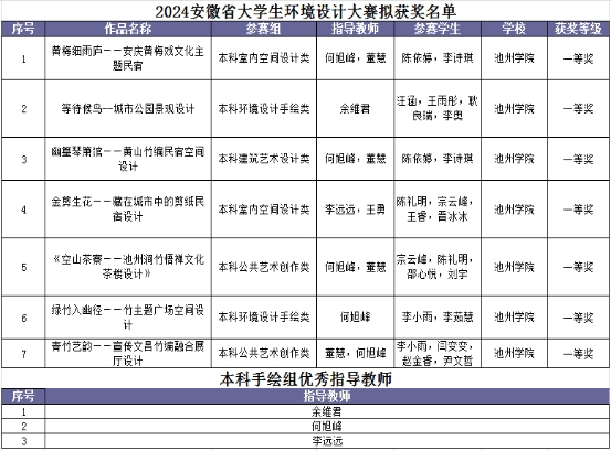 近日,2024年安徽省大学生环境设计大赛评选揭晓。世界杯官网艺术与教育学院学生喜获一等奖7项、二等奖11项、三等奖25项。其中余维君、何旭峰、李远远三位教师荣获优秀指导教师奖。