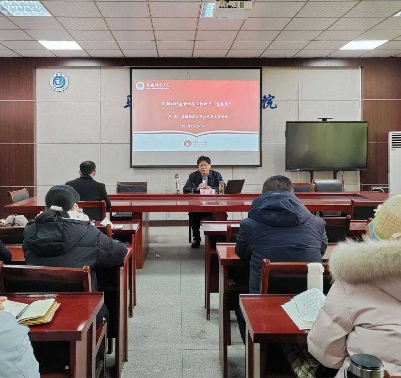 1月15日上午,安徽师范大学马克思主义学院严宏教授作题为“国家社科基金申报工作的“三重视角”的专题讲座,细致解读2024年国家社科基金项目呈现出的新变化,并从管理者视角下的国家社科基金申报工作出发,深入剖析管理者在申报工作中的关注点与侧重点,从评审者视角下解读国家社科基金申报工作,介绍评审者在审阅申报材料时的关键考量因素,还分享了本人申报国家社科基金项目文本撰写的要点与技巧。