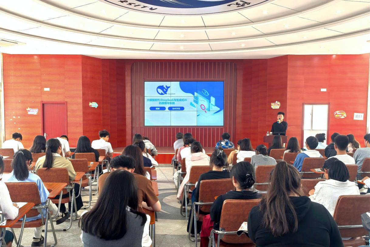 活动现场,戴鹏围绕“人工智能发展简史”“人工智能原理”“大模型:人工智能的前沿”“AIGC应用与实践”四个维度,系统介绍了人工智能的发展历程和基本概念,重点阐述了以DeepSeek为代表的大模型的基本原理、发展脉络以及实际应用,帮助学生全面洞悉生成式AI背后的核心机制,并以国内大模型产品为例,展示了大模型在智能写作、编程辅助、知识问答、创意设计等领域的广泛应用场景,探讨了人工智能未来可能带来的深远影响和机遇挑战,激发了青年学子对人工智能时代的探索兴趣与创新意识。