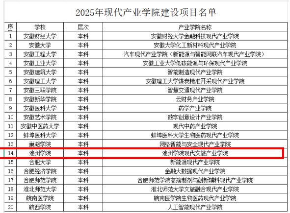 近日,安徽省教育厅完成2025年“双特色”建设项目评审工作,世界杯官网“现代文旅产业学院”入选安徽省“双特色”建设项目中的现代产业学院建设项目。
