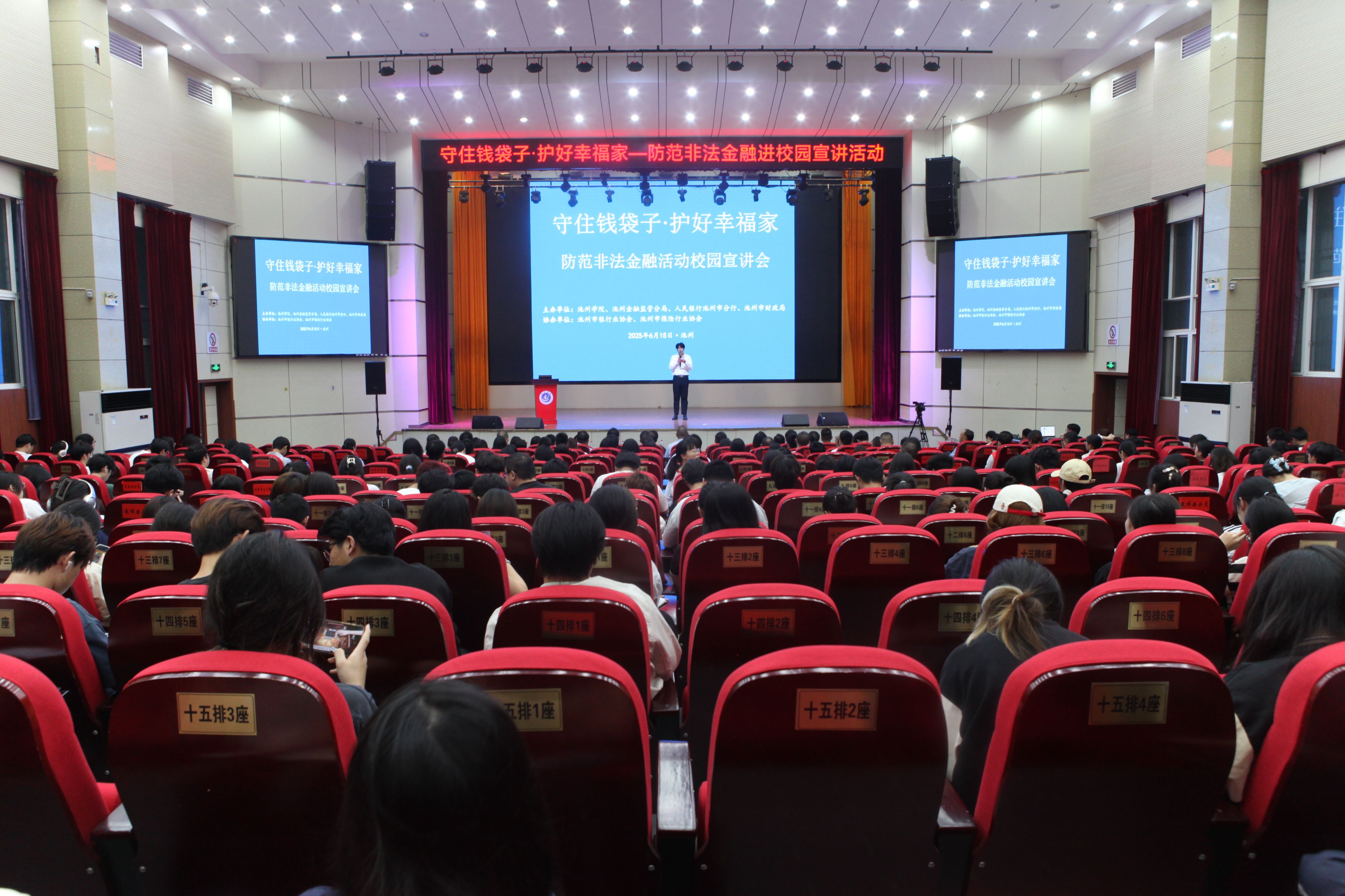 为切实提升世界杯官网师生防范非法金融活动意识,营造安全稳定的校园金融环境,6月15日,学校联合池州金融监管分局、池州市财政局、池州市银行业协会、池州市保险行业协会在博古大礼堂举办以“守住钱袋子、护好幸福家”为主题的专题宣讲,校党委委员、副院长张赛出席活动并致辞。