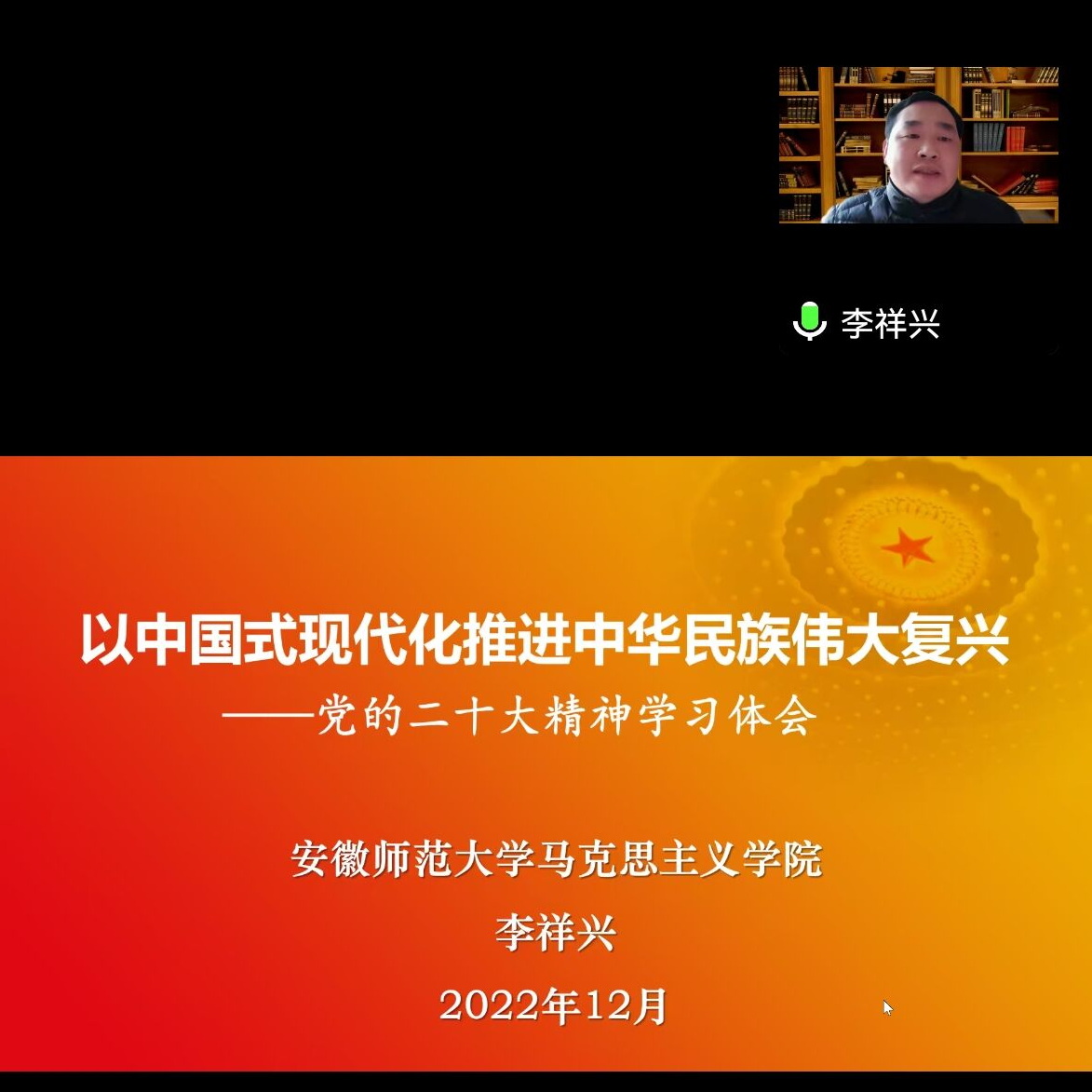 按照省委教育工委统一部署,12月21日,全省高校学习宣传贯彻党的二十大精神专场宣讲报告会在世界杯官网举行。安徽师范大学马克思主义学院副院长、省委讲师团高端宣讲专家、省高校师生巡讲团成员李祥兴教授应邀在线上作专题宣讲报告。校党委书记孙晓峰主持报告会。校党委理论学习中心组成员,部门主要负责同志、二级学院党政主要负责同志集中收看了报告会。