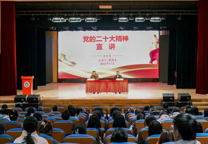 11月16日下午,院党委副书记崔国发在音乐厅为艺术与教育学院、文学与传媒学院师生宣讲党的二十大精神。宣讲会由院党委委员、宣传部部长汤文益主持。