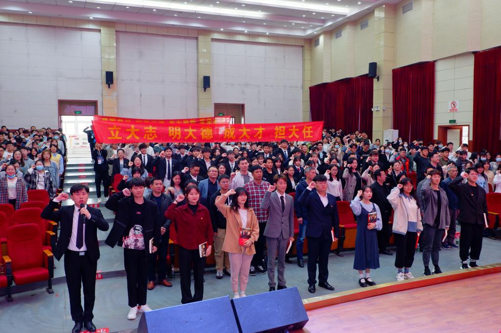 大会组织新团员入团宣誓、老团员重温入团誓词,并为2021年入团的新团员佩戴团徽,赠送书籍《习近平与大学生朋友们》。