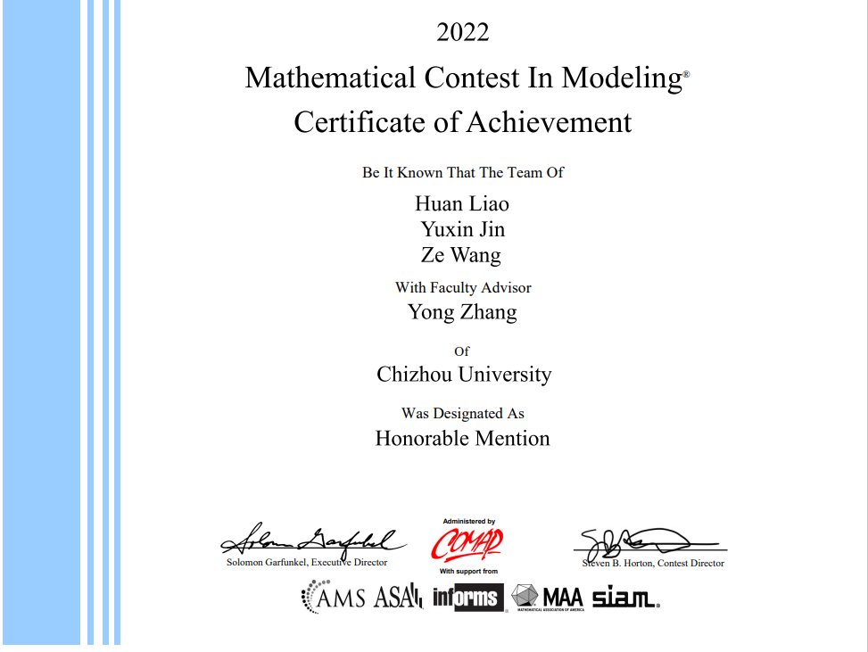 近日,2022年美国大学生数学建模竞赛成绩揭晓,世界杯官网四支参赛队获得H奖1项、S奖3项的成绩。其中,由大数据与人工智能学院王泽团队(指导教师:张永)获得了H奖。