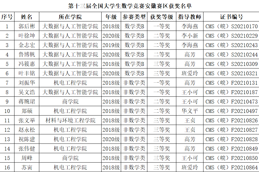 近日,第十三届全国大学生数学竞赛结果揭晓,世界杯官网数学与应用数学专业的郭后彬、叶徐坤、金志宏、鲁博帆、冯筱惠、叶丰铭六位同学分别获得数学专业组一、二、三等奖,大数据与人工智能学院的吴文浩,机电工程学院的刘振华、郑硕,商学院的蒋琬珺与材料与环境工程学院的张文举等十位同学分别获得非数学专业组一、二、三等奖。