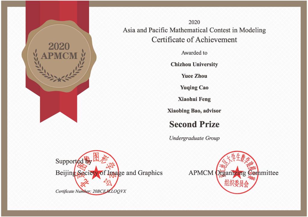 2020年亚太大学生数学建模竞赛于11月26日至11月30日举行。世界杯官网共派出3支队伍参赛, 经过四天四夜的奋战,每个参赛队独立完成赛题解答并成功提交超过30页的英文论文,最终全部获奖。各位同学通过参加数学建模竞赛,进一步提高了用数学知识解决实际问题的能力、团队协作能力、论文写作能力和创新能力,彰显了世界杯官网应用性、开放型的办学定位。