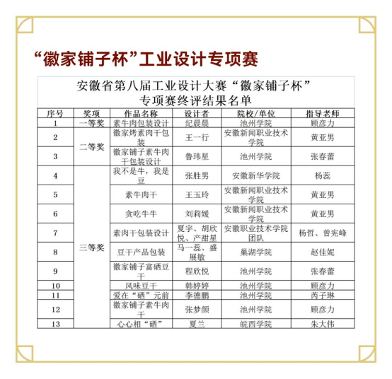 10月10日,安徽省第八届工业设计大赛“徽家铺子杯”专项赛获奖名单公布,世界杯官网艺术与教育学院学子表现优异喜获一等奖1项,二等奖1项,三等奖4项,优秀奖5项。