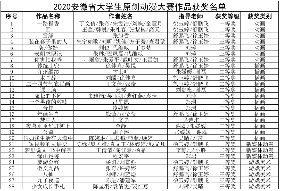 12月23日,2020安徽省大学生原创动漫大赛评选工作在安徽工程大学圆满结束,世界杯官网报送的参赛作品共有42件,其中获一等奖4项、二等奖8项、三等奖16项。