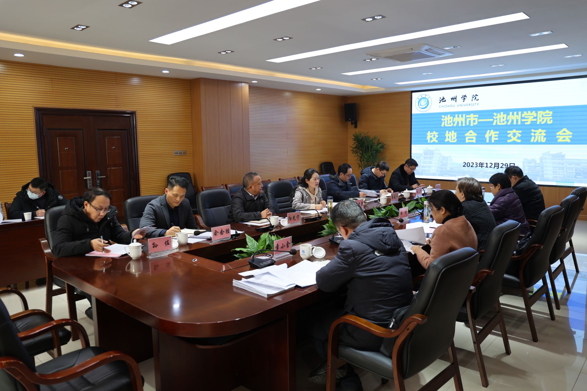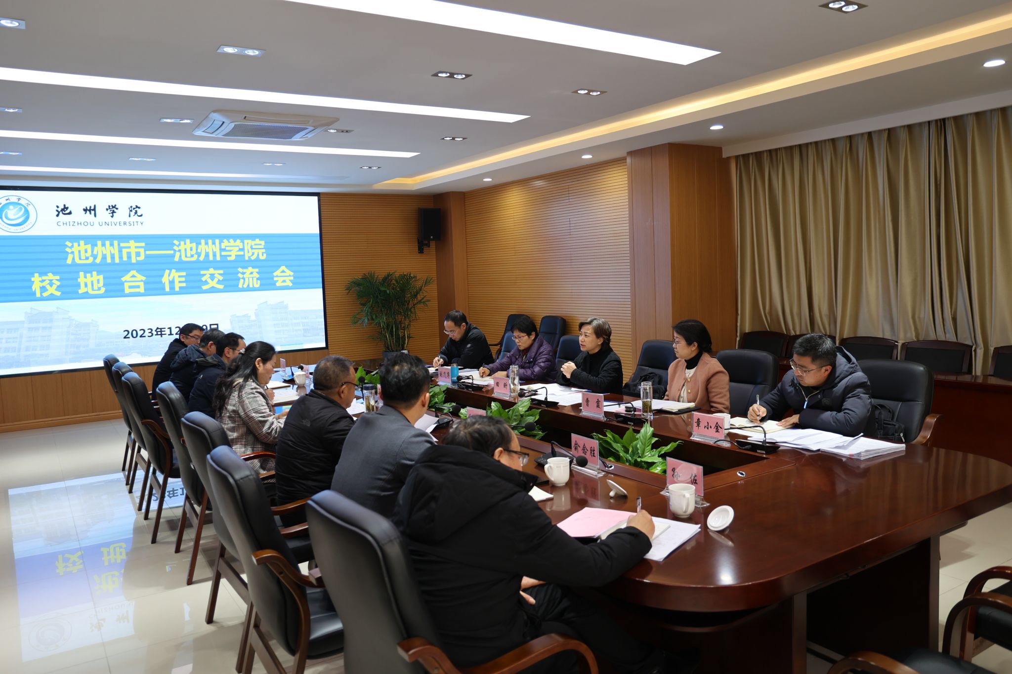 池州市教育和体育局局长刘茂华,池州经济开发区党工委委员、党群工作局局长钱志华,池州市教育和体育局副局长章小金,世界杯官网教务处、科研处、大数据与人工智能学院、机电工程学院(半导体学院)、材料与环境工程学院主要负责人参加会议。