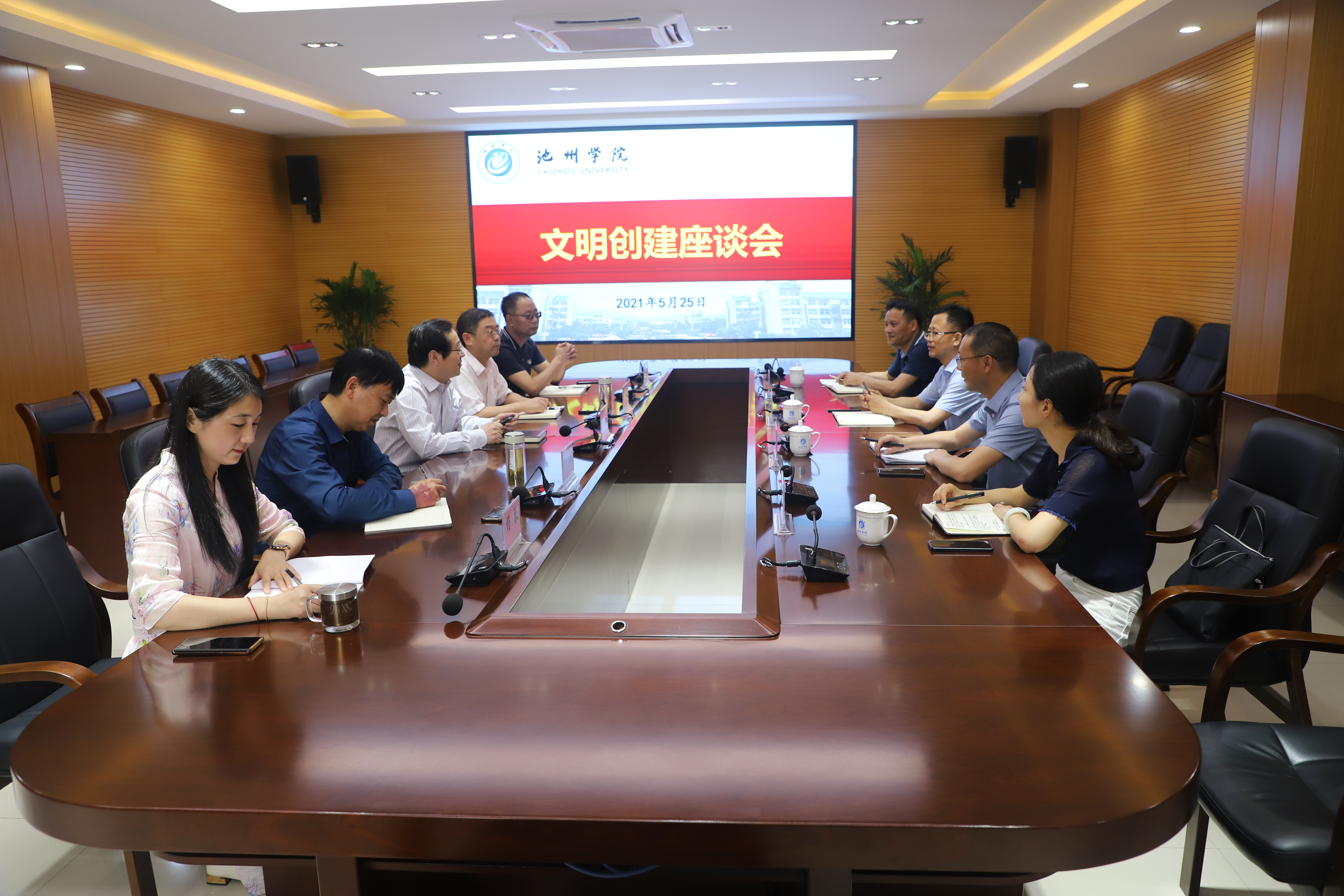 5月25日,池州市文明办主任许作峰、副主任张忠祥一行4人来校调研指导文明创建工作。校党委书记孙晓峰出席座谈会并讲话。校党委副书记崔国发,校党委委员、宣传部部长、文明办主任胡兵参加了座谈会。