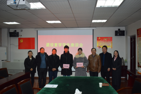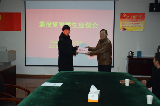 在材料与环境工程学院退役复学学生座谈会上,汪贤才与退役复学学生代表进行亲切交流,关切询问他们在学习、生活等方面遇到的困难和问题,并送上慰问金,勉励他们永保“退伍不褪色”的军人作风。