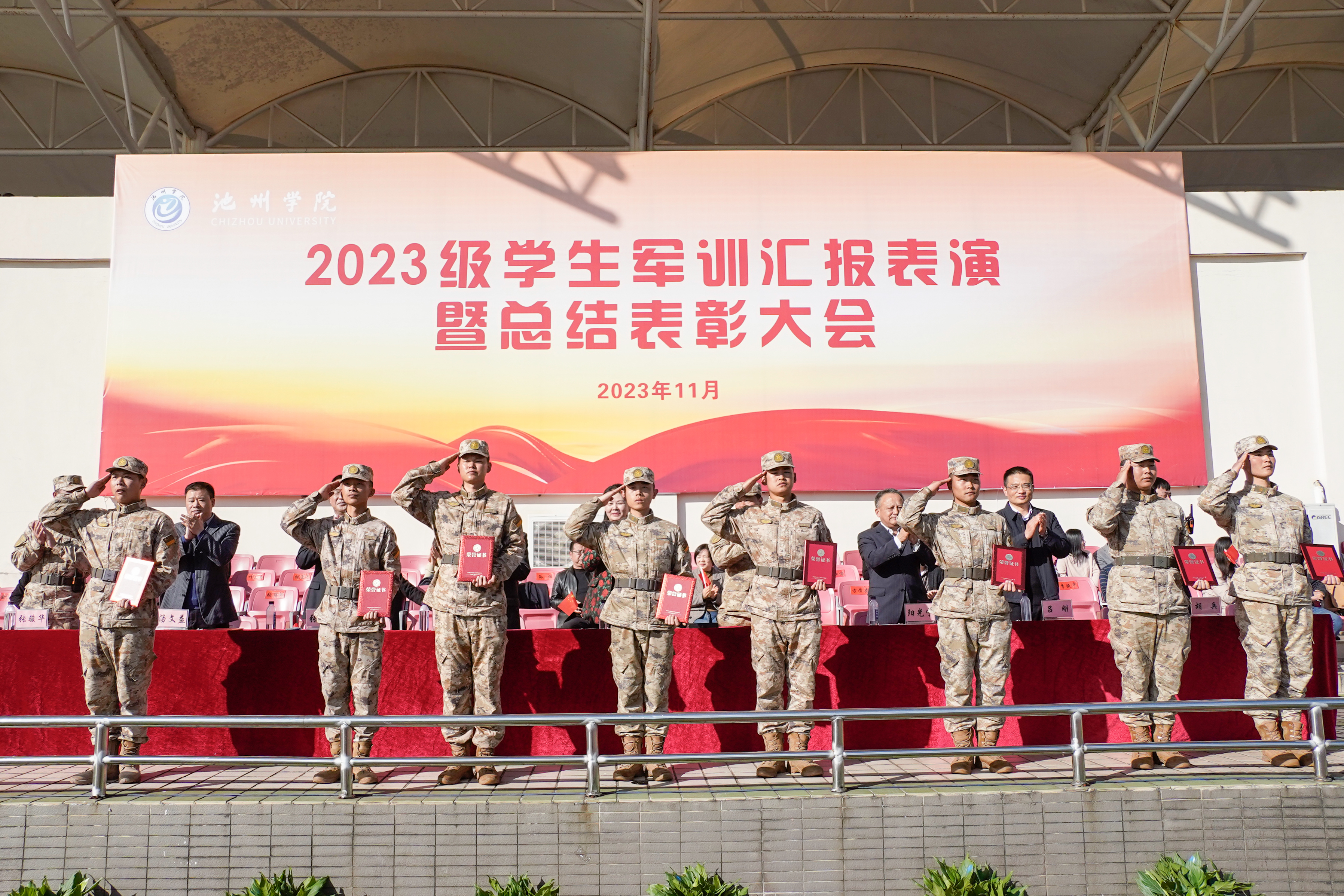 11月21日上午,学校举行2023级新生军训汇报表演暨总结表彰大会。党委副书记、院长郑兰荣出席大会并讲话。校党委班子成员崔国发、阳光宁、吕刚、张赛、胡兵、汤文益及承训部队上校副参谋长李勇、少校副营长张骏华在主席台就坐。大会由党委委员、副院长阳光宁主持。