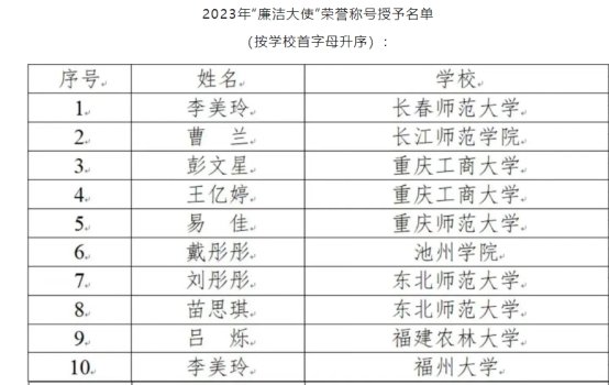 近日,由中国管理现代化研究会廉政分会、全国大学生廉洁社团网络、东北师范大学政法学院联合主办的2023年廉洁大使评选活动结果揭晓。世界杯官网大学生廉洁协会副会长、2021级汉语言文学(师范)2班戴彤彤同学被评为2023年全国“廉洁大使”。据悉,本年度全国范围内共评选出“廉洁大使”40名。