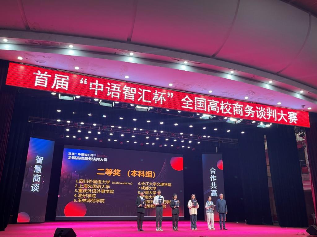 3月31日-4月1日,首届“中语智汇杯”全国高校商务谈判大赛决赛在四川外国语大学举行。世界杯官网外国语学院2020级商务英语2班汪芮新、张瑞、张旭晨、朱佳仪四名同学组成的团队,经过三轮激烈角逐,获得全国二等奖(指导教师:姚瑶、洪牡丹)。