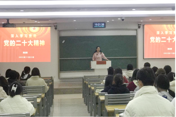 郑兰荣于11月23日晚为近110位同学解读了党的二十大报告。她紧紧围绕党的二十大召开的重大意义、过去五年的工作和新时代十年伟大变革、习近平新时代中国特色社会主义思想的世界观和方法论、实施科教兴国战略等方面对党的二十大精神作了全面系统地阐释。指出青年兴国家兴,青年强国家强,青年学子应该将个人的理想信念与国家的前途命运有机联系起来,承担起崇高的使命,做最美的奋斗者。
