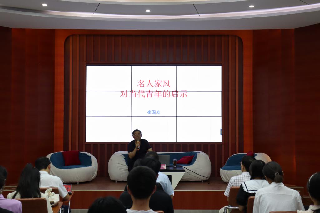 在近两小时的讲座中,崔国发以文学的经典、用文学的视角、借文学的案例,生动地阐释了什么是家风、为什么要建设家风、当代青年如何汲取优秀家风文化营养等。整场讲座内涵深刻、幽默风趣、逻辑清晰、饱含深情,讲座中列举了大量文化名人的经典案例,以独特的视角和深厚的文学素养诗情画意地呈现出一个个生动的家风故事,为现场师生带来了一场家风文化的盛宴。
