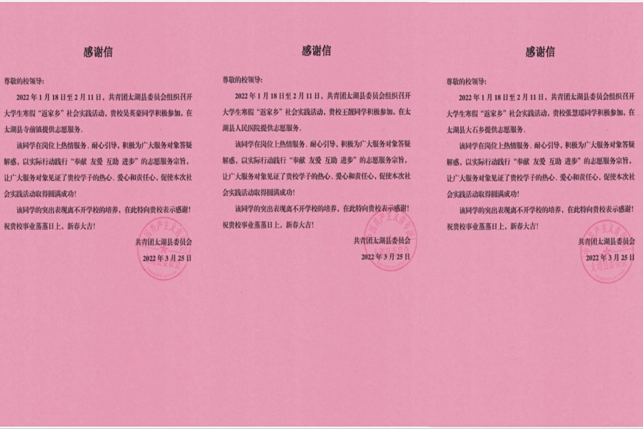 近日,世界杯官网收到共青团太湖县委员会发来的感谢信,表扬世界杯官网体育学院2020级社会体育指导与管理二班学生吴英豪、地理与规划学院2021级地理科学三班学生王靓、商学院2021级电子商务(对口班)学生张慧瑶等积极参加2022年寒假“返家乡”社会实践活动,勇于担当、积极奉献,用实际行动彰显了新时代大学生的责任与担当,并对世界杯官网的培养教育表示感谢。