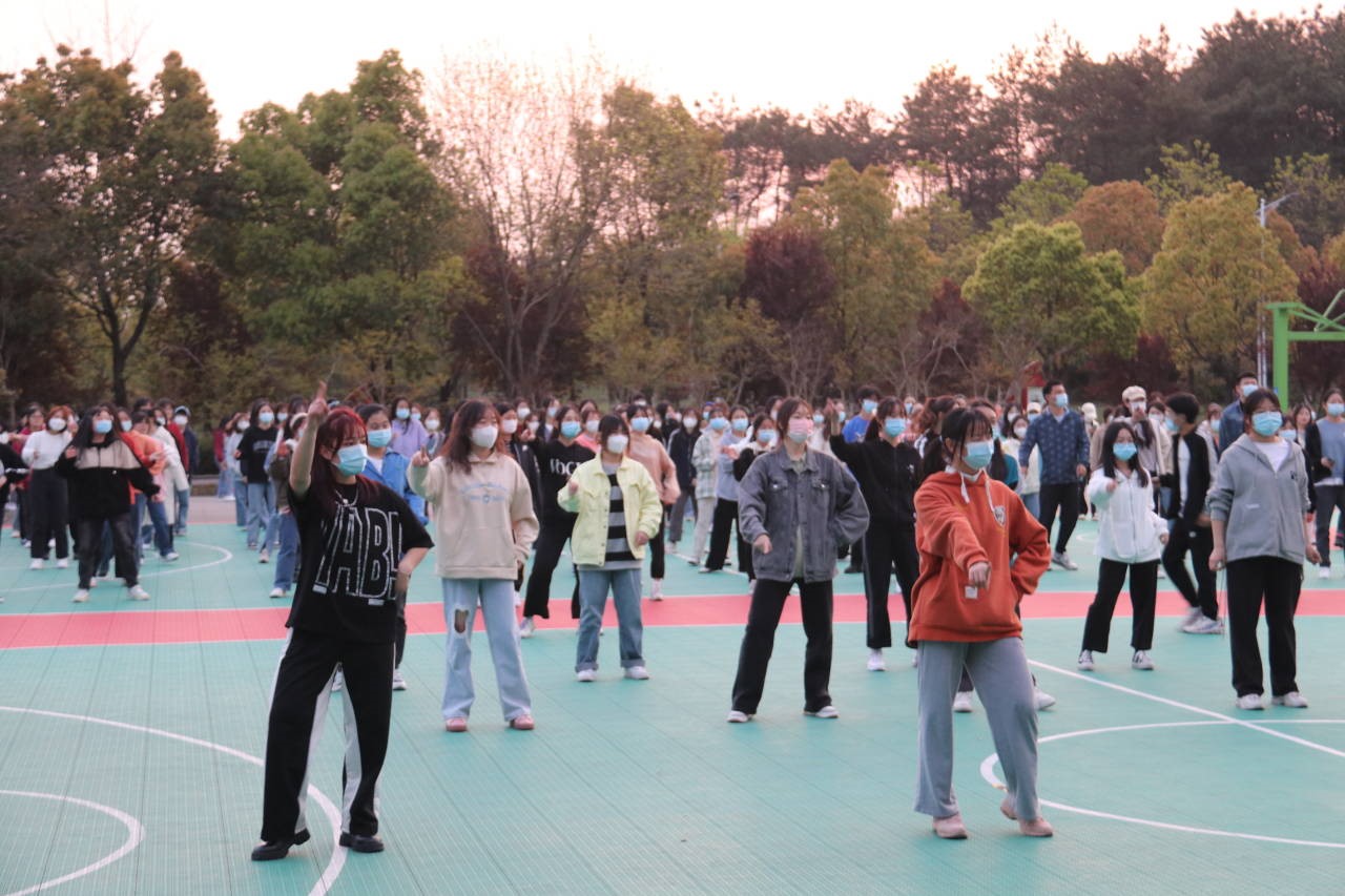 学校一食堂操场上,在健美操社团领舞人的带领下,同学们有序加入广场舞学习队伍,伴着旋律,跟着节奏跳起舞来。