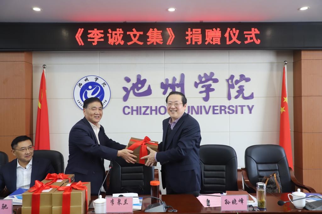 11月1日上午,《李诚文集》捐赠仪式在办公楼北三楼会议室隆重举行。李诚先生哲嗣李皋兰、东至周氏文化研究会副秘书长马民新出席捐赠仪式,校党委书记孙晓峰出席仪式并致辞,校领导张立驰、崔国发、王延寿、汪海出席仪式,汪贤才主持仪式。